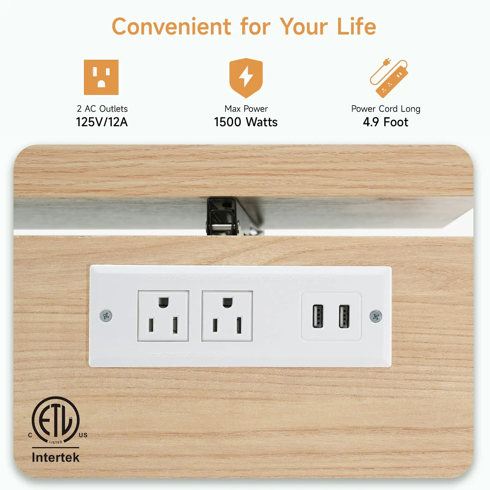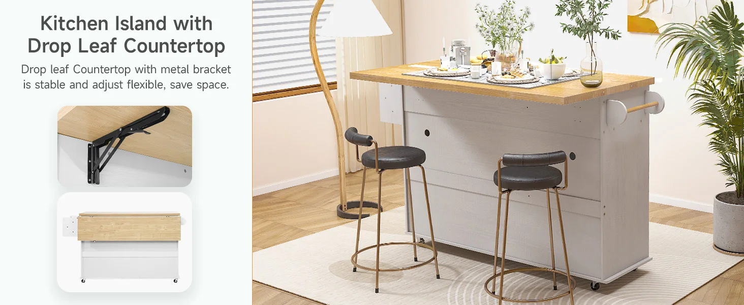 Mobility is effortless with five metal caster wheels, four of which are lockable to ensure secure positioning. The island also includes a 1500W power outlet with two USB ports and two three-hole sockets, making it easy to power appliances or charge devices directly from the countertop.